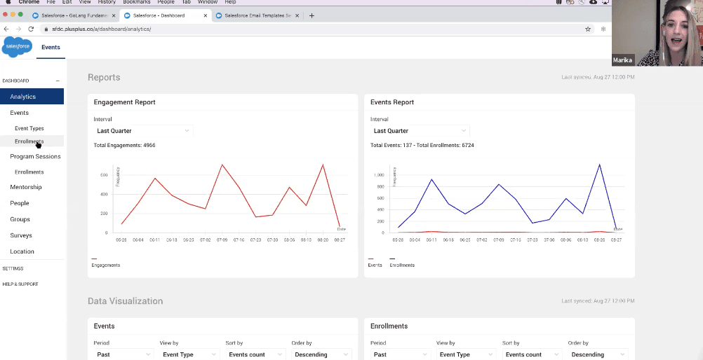 Marika Spediacci (Associate Program Manager, Technology Marketing Products Learning) and her Tech & Products Learning team of 3 at Salesforce are able to make it possible to offer and manage hundreds of classes every quarter, for 4 different organizations at Salesforce. More than 18,000 Salesforce employees around the world use the PlusPlus platform to find, book, attend, and grade the classes they need to grow.