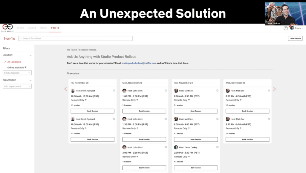 “In concept, this is similar to office hours. It’s us setting up aside the time for someone when they need it. Except the difference is it optimizes our time. So, for example, if no one books that 1-on-1, we get that time back to work on other things whereas with the traditional office hours, you’re just sitting there waiting for someone to pop in. This new approach fits well with how we do things at Netflix.”