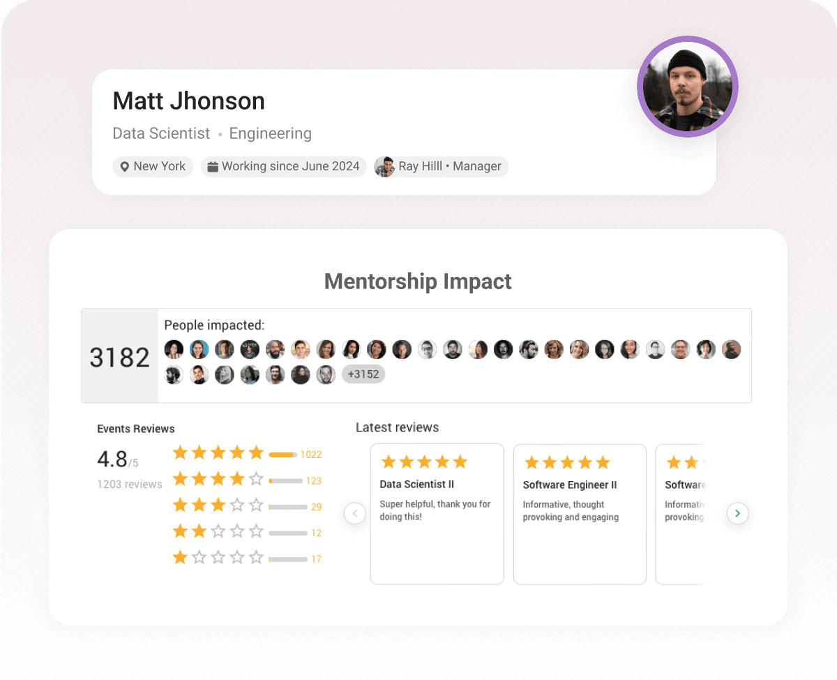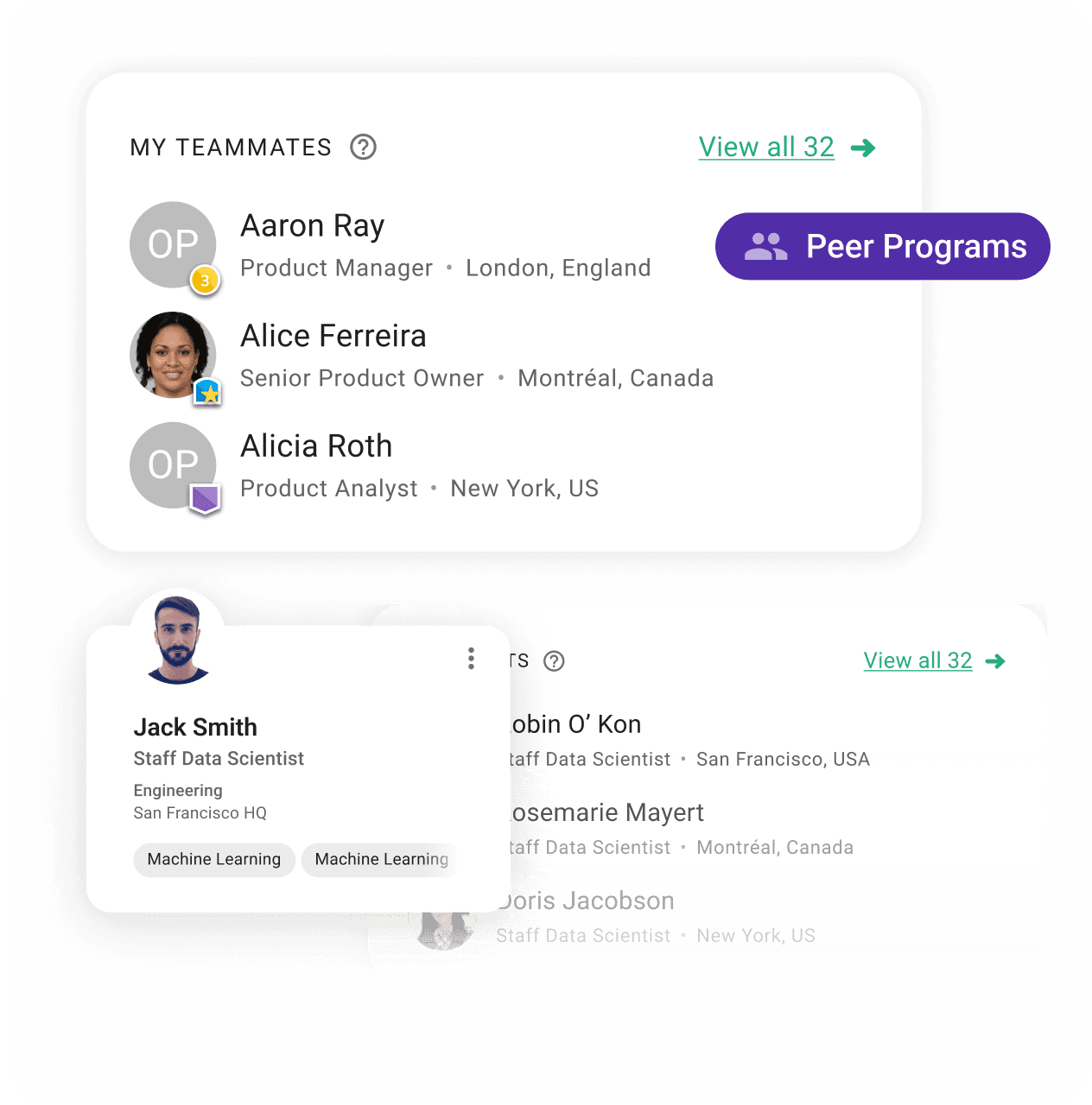 AI-powered discovery enables your people to discover the experts they need by title, expertise, location, seniority, and more.