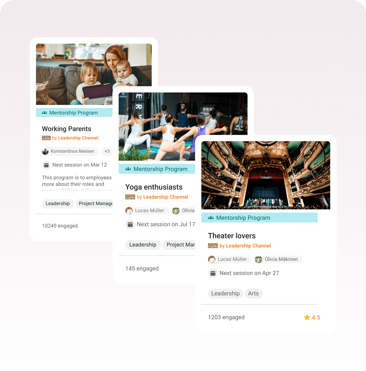 Foster connection and community for your people based on any shared experience, such as working parents, yoga enthusiasts, or theater lovers.