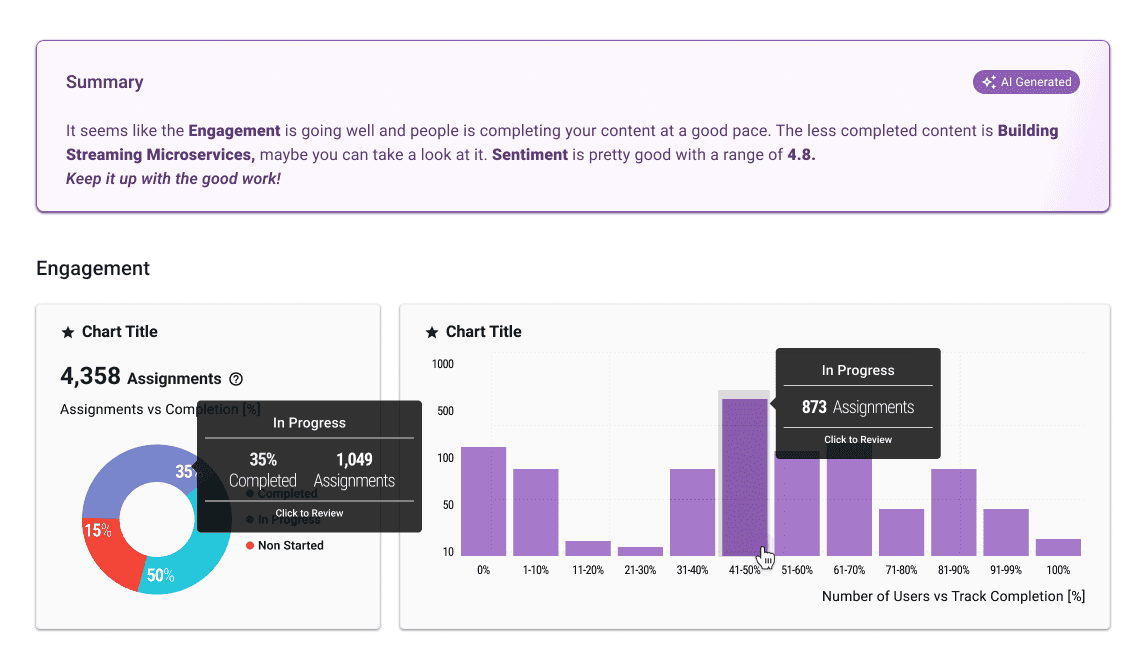 Every track, course, event, article, and video comes with built-in engagement and sentiment data. You see who’s completed, who’s stuck, and how content is received—right where learning happens. Insights surface answers immediately and let you drill deeper, filter by cohort, or take bulk actions, so data leads directly to impact.